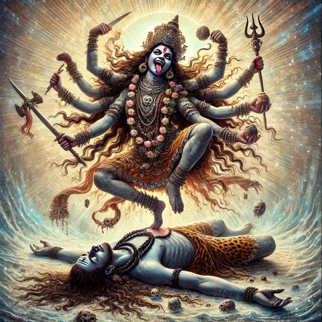 The dynamic between Kali and Shiva reflects the principle that inner resolution often impacts the outer world. When Shiva (inner peace and awareness) remains steady, Kali’s destructive dance (external turmoil or emotional chaos) ultimately leads to transformation rather than annihilation. This imagery reminds us that when we resolve our inner chaos, we often see the crises of the outer world begin to dissipate.