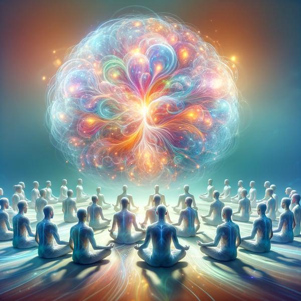 **A Shared Field of Consciousess Initially, group meditation mirrors the process of solo meditation, intensifying our empathetic self-connection. When we close our eyes during meditation, our body awareness is immediately amplified, grounding us in a realm of "I am Me" consciousness, centered around our physical being. This heightened awareness then extends beyond ourselves, allowing us to become more aware of our surroundings, even with our eyes closed. In this introspective state, we become attuned to the presence of others nearby. This progression into "You are part of Me" consciousness deepens our connection with those around us, fostering a profound, intimate bond that transcends language, where words, while helpful, are not necessary for this shared experience fo precense.