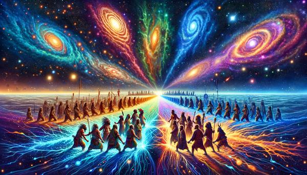 As a general rule, group meditation unfolds as a linear expansion of the collective consciousness. A notable indicator of this linear extension in the consciousness circle is the emergence of an 'us versus them' mentality, which manifests as a 'we are holier than you' attitude. As explored in the previous chapter, "Fields of Consciousness," our tribal legacy of forming bonds typically evolves from smaller units to increasingly larger collectives, such as nations. This progression often creates a metaphorical protective barrier, delineating a sense of order (cosmos) in contrast to disorder (chaos), reflecting our innate tribal instinct to define and protect our group identity.