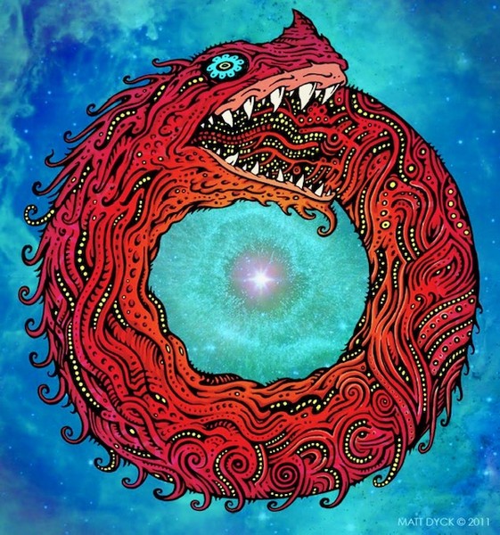 **The development of the self feeding ouroboros-consciousness is a deterministic consequence of the holy mathematics' own unfolding. Like the Ouroboros serpent, this mathematics will bite its own tail, change its own course, and thereby abolish its own laws. I first encountered this line of thought outside of my own head when I attended a lecture by Holger Bech Nielsen as a high school teacher. He spoke of a particle that was shot out and hit itself, changing direction in the collision and therefore not hitting itself.