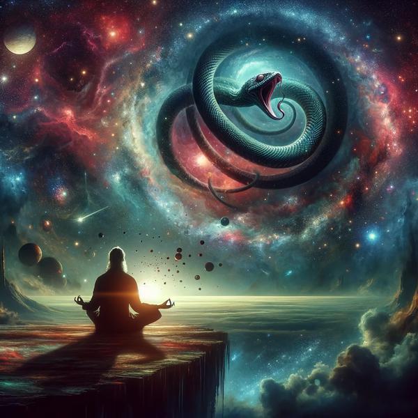 However, the self-devoured intellect re-emerges, not as a repetitive Phoenix reborn from ashes, but as something novel and vibrant, humbly assuming the role of a counselor. Becoming its own beginning in the end, like the Ouroboros snake, the intellect deeply understands that there is fundamentally nothing to understand. In this relization, the transformed intellect serves as a humble guide to the cosmic fool that is our true essence, albeit in a radically different context and environment.