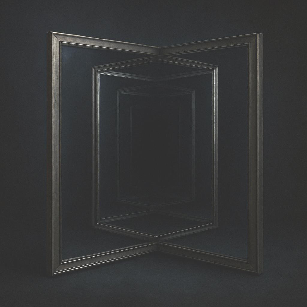 A mirror is a perfect metaphor for consciousness. Consider a mirror reflecting the objects placed before it: this illustrates the default mode of human consciousness, through which we perceive and become aware of the external world. Now imagine a mirror positioned directly opposite another mirror, creating a simple recursive loop. In this initial state of awakening, we experience our first fall from innocent, paradisiacal grace—the shock of shameful self-awareness, as we face the ego-monster we ourselves have become. Finally, envision two mirrors infinitely reflecting each other, forming an endless regression. Here, the shores of paradise reappear in a transformed state, where egos and monsters dissolve into a glorious void.